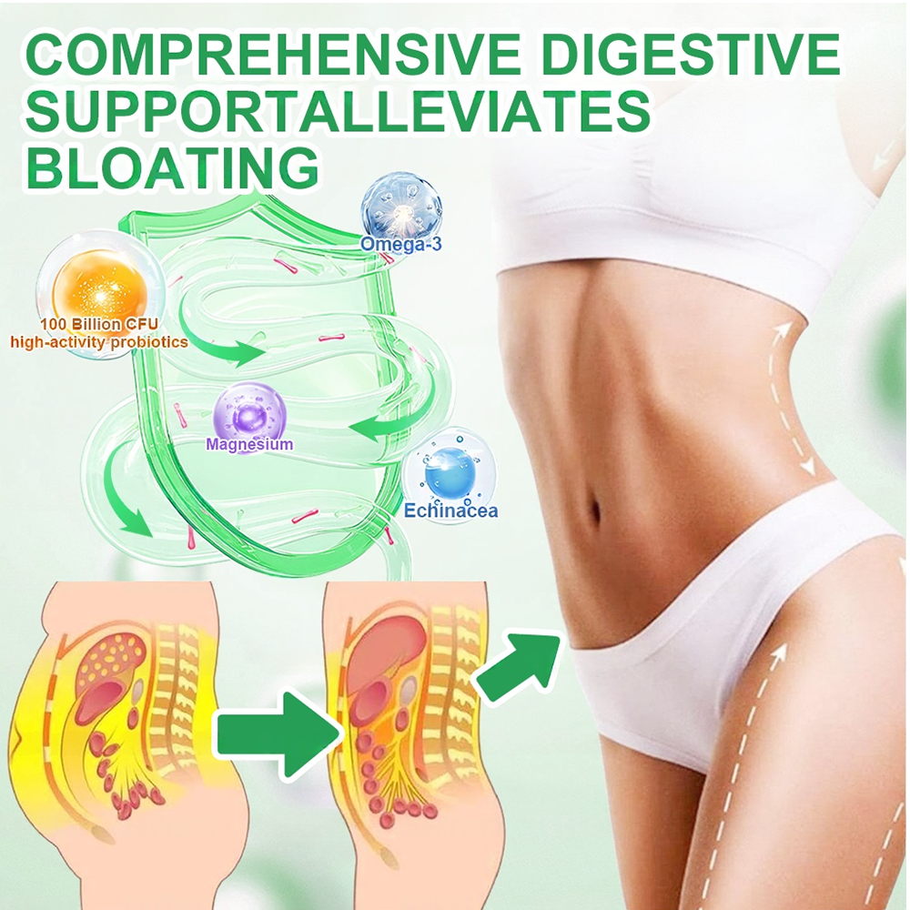 100 Billion CFU high-activity probiotics (including Lactobacillus rhamnosus GG, Bifidobacterium lactis BB-12, Lactobacillus plantarum, Bifidobacterium breve, and Lactobacillus casei, etc.) rapidly restore gut microbiota balance, suppress harmful bacteria, and increase beneficial bacteria. They relieve bloating and discomfort, promote regular motility and nutrient absorption, and strengthen immune defenses. Clinical data show that 92% of users experienced significant digestive improvement and reduced bloating within 2â4 weeks. At the same time, Echinacea stimulates immune defenses, apple cider vinegar powder enhances gut motility, Omega-3 reduces inflammation and protects the immune system, while magnesium helps balance stress and indirectly supports gut function. These ingredients work synergistically to maximize the core benefits of probiotics for gut health and immunity.